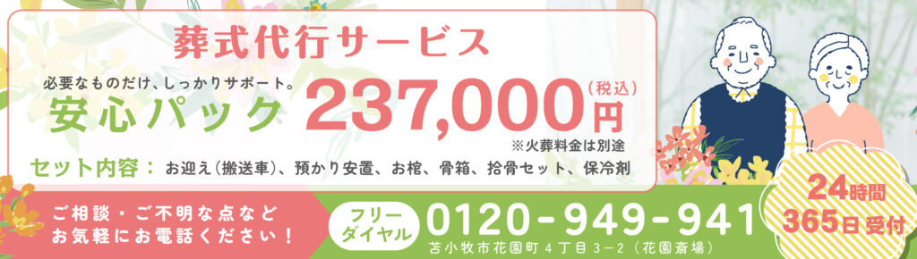 葬式代行サービス(0120-949-941)までご連絡ください。深夜・早朝であっても速やかに必要な手配、その後の流れなどをご案内いたします。